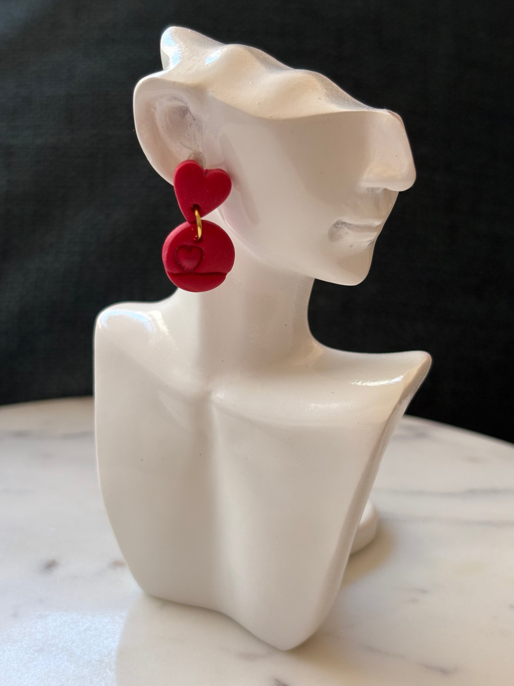 A shimmering mini heart inside a circle with a small red heart gold stud earring.