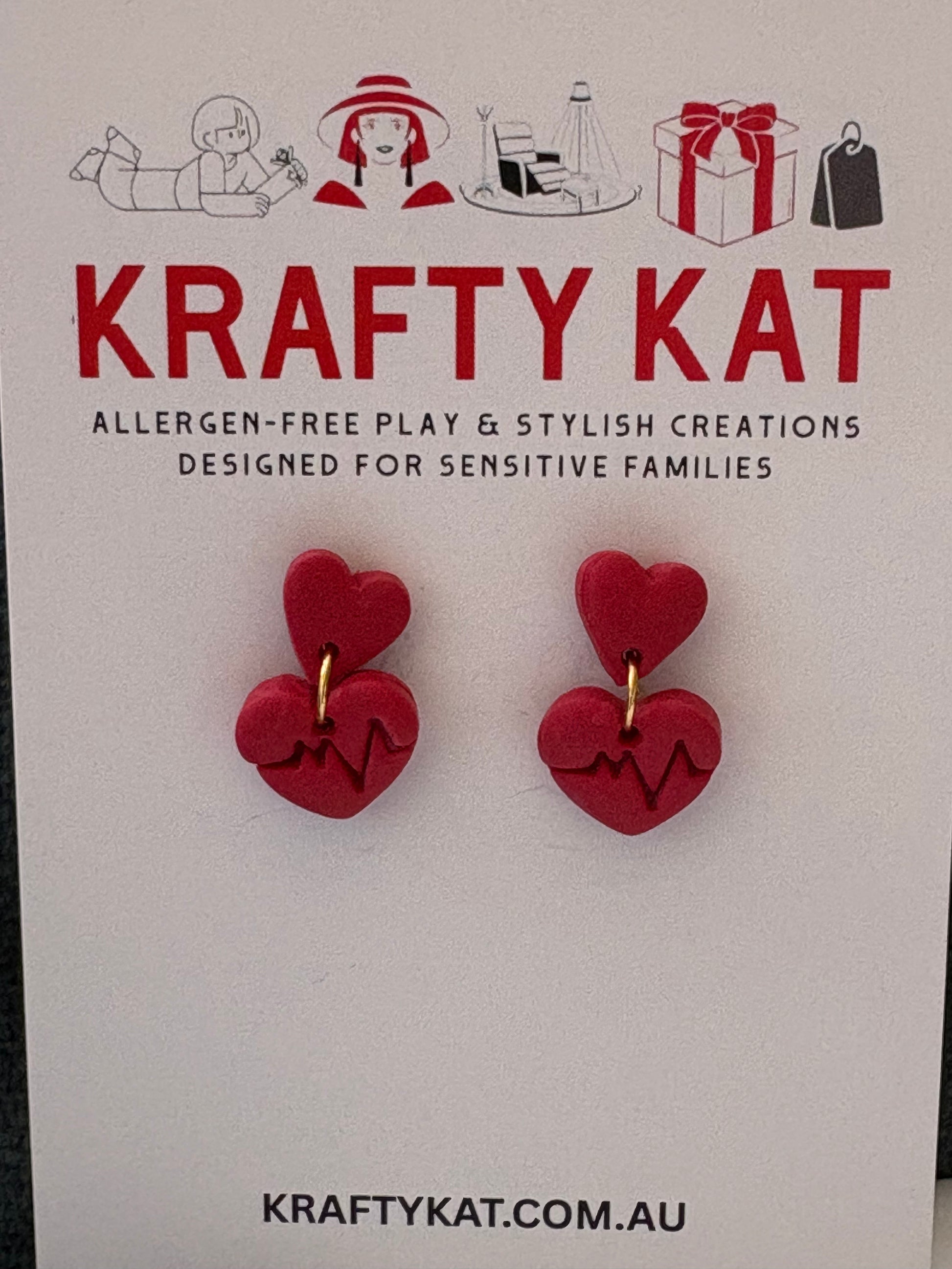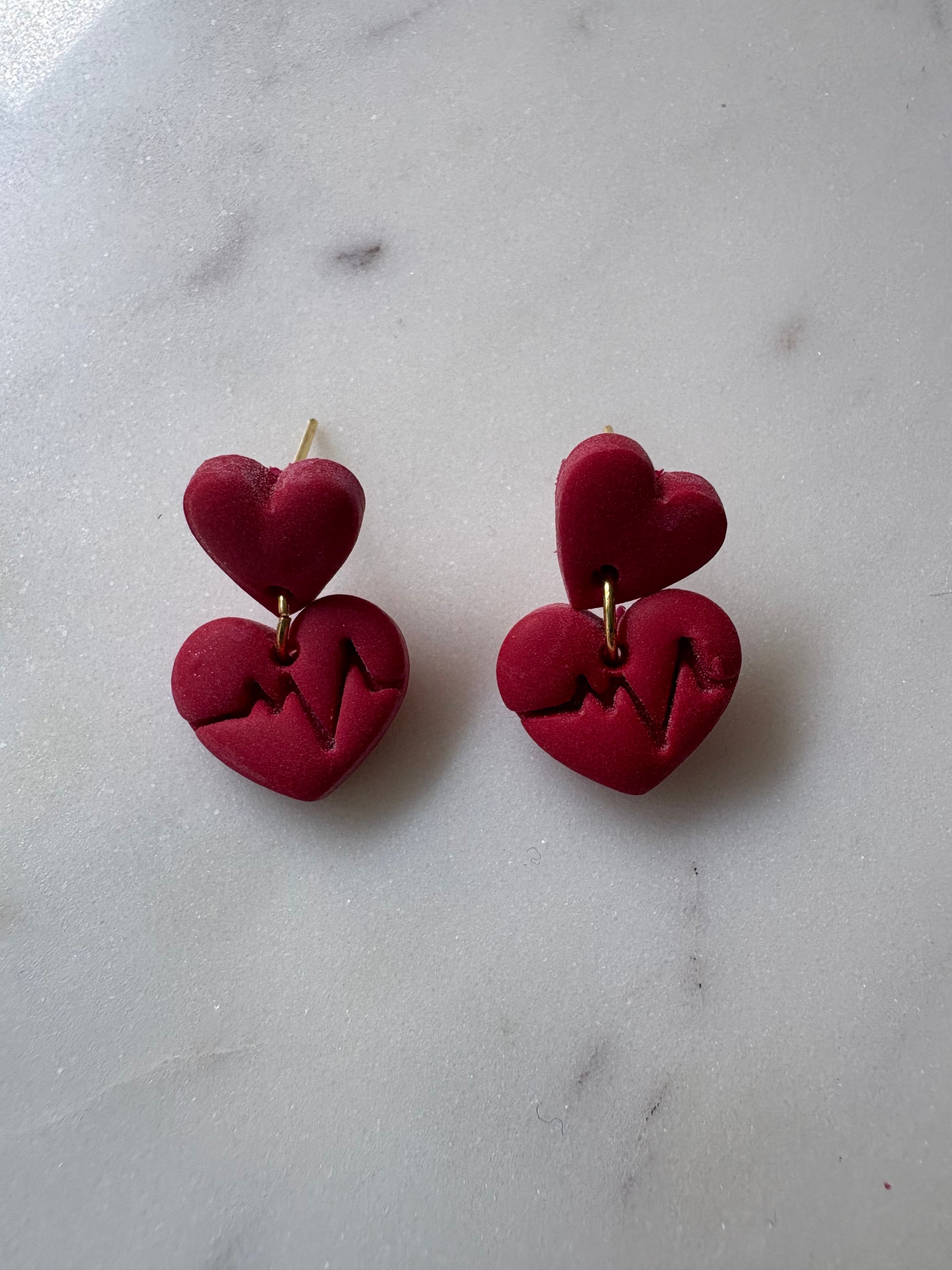 Small Red Heart with a Red Circle with a Heartbeat Line Dangle Gold Stud Earrings