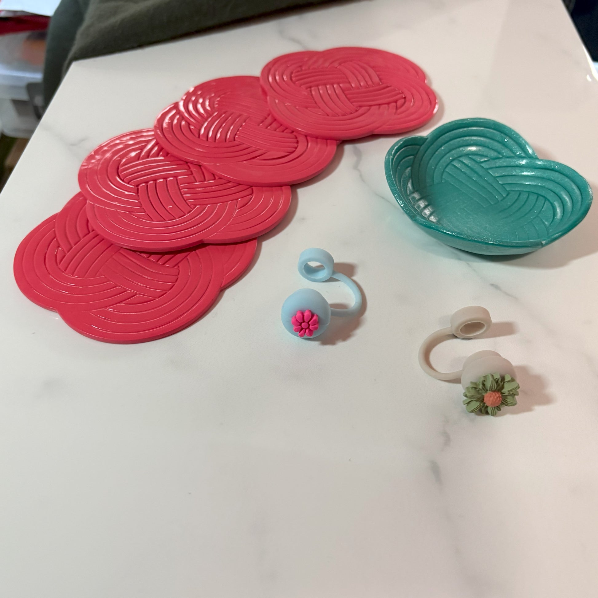 Our Everyday Essentials Set brings playful charm + practical style to your space. Includes handmade polymer clay coasters, tray, and straw covers—all in colours you’ll love.